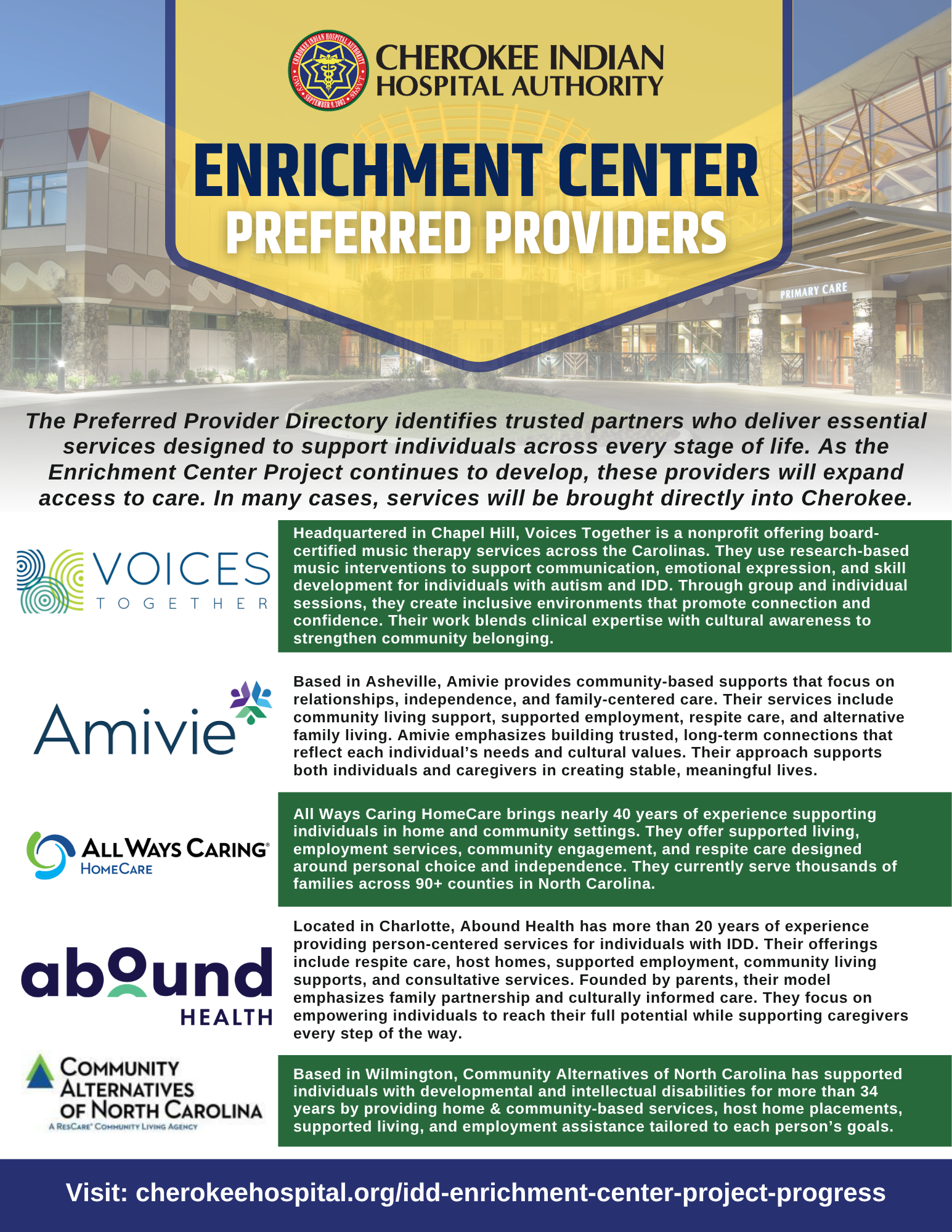 For more information about the IDD Preferred Provider Directory and the Enrichment Center Project progress, visit the newly launched dedicated landing page at www.cherokeehospital.org/idd-enrichment-center-project-progress.