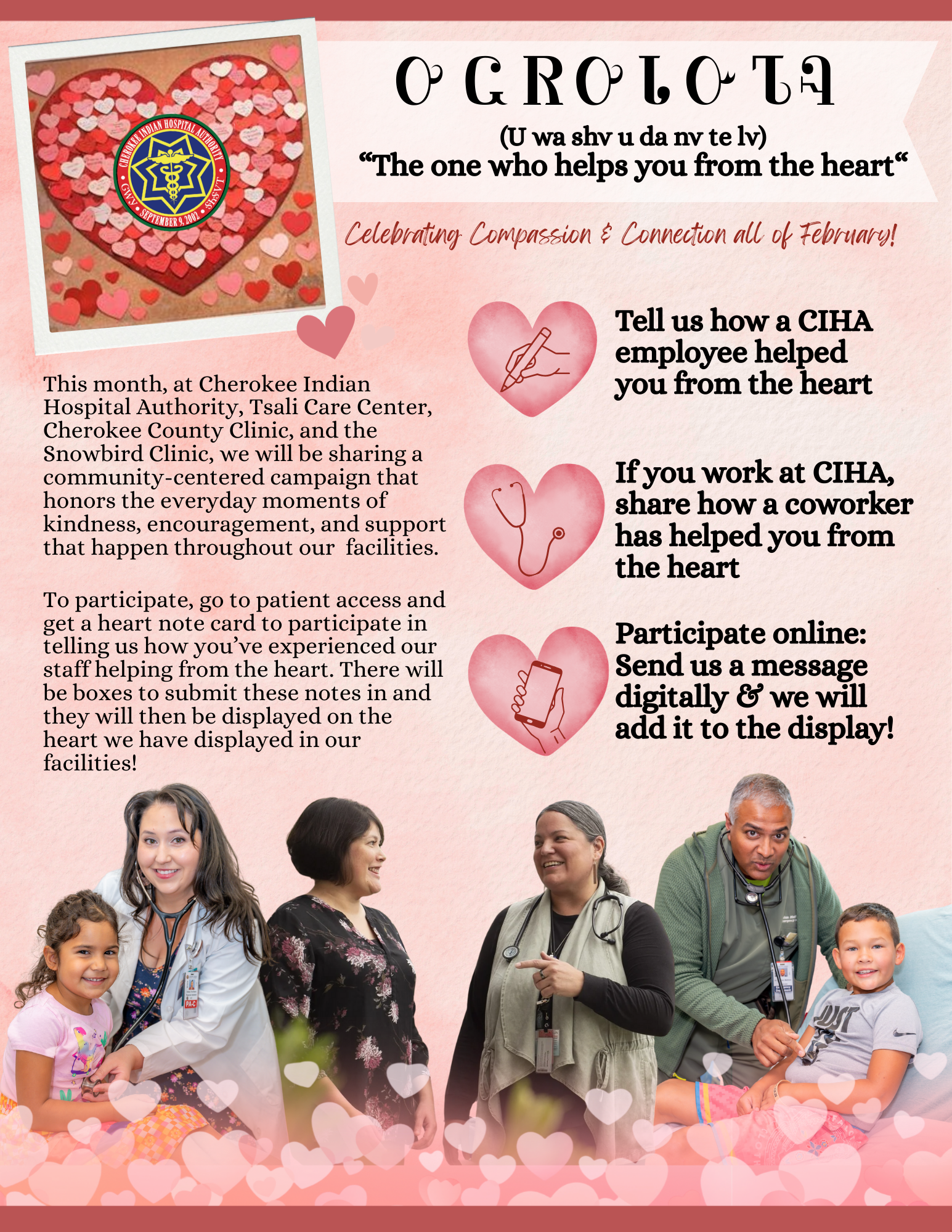 Care is more than a service at Cherokee Indian Hospital Authority. It is a relationship built on trust, respect, and compassion. This February, CIHA is sharing a community-centered campaign that honors the everyday moments of kindness, encouragement, and support that happen throughout our hospital.