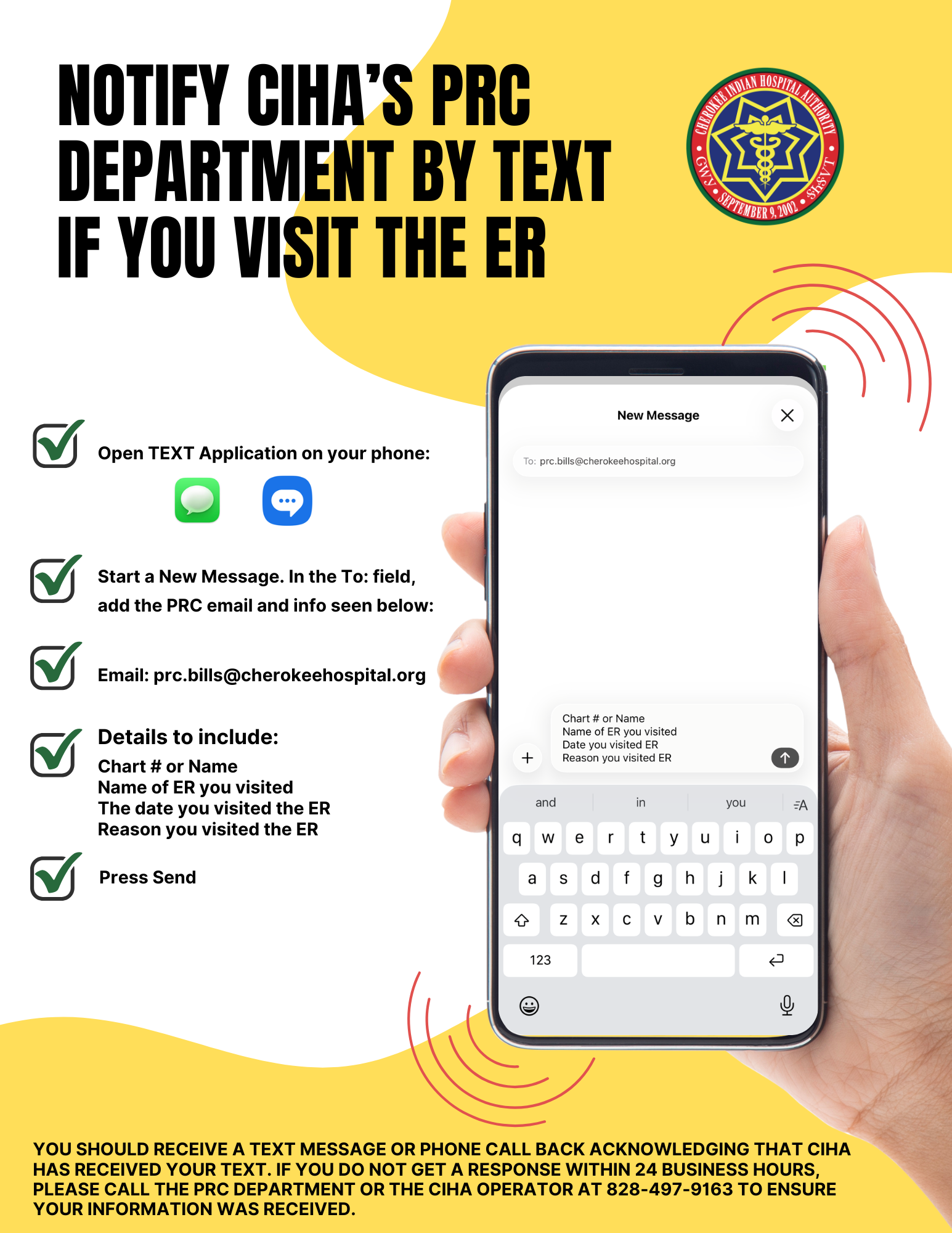If you receive emergency medical care outside of Cherokee Indian Hospital Authority (CIHA), it is important to notify the Purchased/Referred Care (PRC) department within 72 hours of your treatment. This notification is required so PRC can determine eligibility for coverage and begin the process of reviewing and coordinating payment for your care.